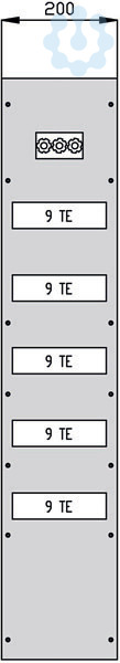 vorbereitet für Kundeneinbauten mit Sicherungselement 3P 63A D02 -ohne Sicherungseinsätze- mit 5 Hutschienen á 9TE