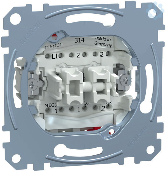 Die linke Wippe ist als Wechselschalter 10 AX, AC 250 V und die rechte Wippe als Taster 10 A, AC 250 V ausgeführt. Eigenschaften-Frontseitige Mess- und Prüfkontakte, zugänglich ohne Schalterdemontage. Schnellgewindeschrauben für die Krallenbefestigung. Versenkte Krallen mit Rückstellfeder. Hochglanzverzinkter Tragring isoliert zur Kralle. Mit Krallen- und Schraubbefestigung. Mit Steckklemmen. Zu komplettieren mit Doppelwippen für Schalter/Taster System M.