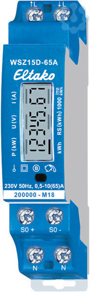 Nur geeichte Zähler sind nach Paragraph 25 des deutschen Eichgesetzes zur Stromabrechnung zugelassen. Nichtbeachtung ist eine Ordnungswidrigkeit nach Paragraph 19. Maximalstrom 65A, Stand-by-Verlust nur 0,4 Watt. Reiheneinbaugerät für Montage auf Tragschiene DIN-EN 60715 TH35. 1 Teilungseinheit = 18mm breit, 58mm tief. Genauigkeitsklasse B (1%). Mit S0-Schnittstelle. Dieser Wechselstromzähler misst die Wirkenergie anhand des zwischen dem Eingang und dem Ausgang fließenden Stromes. Der Eigenverbrauch von nur maximal 0,4 Watt Wirkleistung wird nicht gemessen und nicht angezeigt. Es kann 1 Außenleiter mit einem Strom bis zu 65A angeschlossen werden. Der Anlaufstrom beträgt 4OmA. Bei einer zu erwartenden Belastung von mehr als 50% ist ein Lüftungsabstand von 1/2 Teilungseinheit zu daneben montierten Geräten einzuhalten. Ggf. das Distanzstück DS12 verwenden. Zwei N-Klemmen für die sichere Querverdrahtung mehrerer Zähler. Das 7-Segment LC-Display kann auch ohne Stromversorgung zweimal innerhalb von zwei Wochen abge