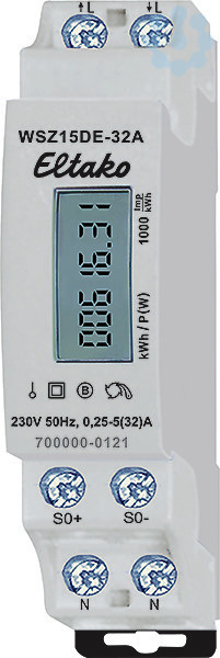 Maximalstrom 32A, Stand-by-Verlust nur 0,4 Watt. Reiheneinbaugerät für Montage auf Tragschiene DIN-EN 60715 TH35. 1 Teilungseinheit =18mm breit, 58mm tief. Genauigkeitsklasse B (1%). Mit S0-Schnittstelle. Dieser Wechselstromzähler misst die Wirkenergie anhand des zwischen dem Eingang und dem Ausgang fließenden Stromes. Der Eigenverbrauch von nur maximal 0,4 Watt Wirkleistung wird nicht gemessen und nicht angezeigt. Wie alle Zähler ohne MID-Konformitätserklärung in Europa nicht für die monetäre Stromabrechnung zugelassen. Alle 30 Sekunden schaltet das Display für 5 Sekunden von der aufgelaufenen Wirkenergie in kWh auf den Momentanverbrauch in Watt um. Es kann 1 Außenleiter mit einem Strom von bis zu 32A angeschlossen werden. Bei einer zu erwartenden Belastung von mehr als 50% ist ein Lüftungsabstand von 1/2 Teilungseinheit zu daneben montierten Geräten einzuhalten. Ggf. das Distanzstück DS12 verwenden. Der Anlaufstrom beträgt 20mA. Das Display kann nur mit Stromversorgung abgelesen werden. Der Verbrauch ist je