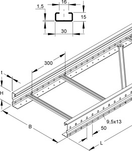 Weitspannkabelleiter, nach DIN EN 61537, mit durchgehend gelochten und gesickten Seitenholmen, sowie eingenieteten Sprossen aus C-Profil mit 16 mm Schlitzweite. Passende Bügelschellen (B... und BK...) finden Sie im KI-Katalog. Stoßstellenverbinder WSV 105.390 bitte gesondert bestellen.