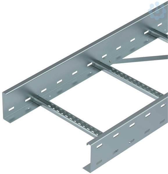 Weitspannkabelleiter für die Überbrückung von Stützabständen ab 3 m. Der Sprossenabstand beträgt 300 mm. Der Seitenholm ist durchgängig gelocht und zur Verstärkung und zum Kabelschutz oben abgekantet. Die Befestigung der Weitspannkabelleiter auf dem Ausleger erfolgt mit Klemmstücken Typ LKS 60/5.