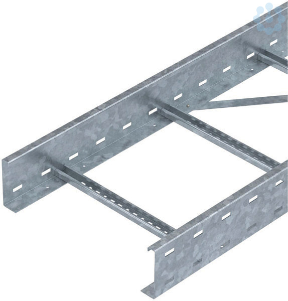 Weitspannkabelleiter für die Überbrückung von Stützabständen ab 3 m. Der Sprossenabstand beträgt 300 mm. Der Seitenholm ist durchgängig gelocht und zur Verstärkung und zum Kabelschutz oben abgekantet. Die Befestigung der Weitspannkabelleiter auf dem Ausleger erfolgt mit Klemmstücken Typ LKS 60/5.