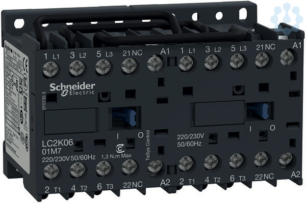 TeSys 3-polige Wendeschütze in kleiner Bauform. Wendeschützkombination, 6A, Spule 230 V 50/60Hz. Anschluss Schraubklemmen, Bemessungsleistung 2,2 kW, Hilfsschalter 1 Ö, MTZ 12. Gerätebreite 90 mm, Schraub- und Schnappbefestigung. 3-polig, je ein integrierter Hilfskontakt, erweiterbar um bis zu je vier Hilfskontakte. Hauptstromverdrahtung bereits durchgeführt. Bemessungsspannung 400 V, nach AC-3.