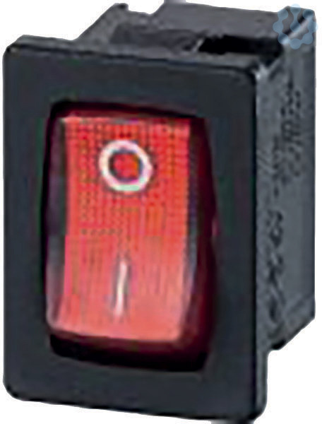 Einbau-Wippenschalter Serie 3631 10(4)A, 250V, 1-polig, Umschalter unbeleuchtet, T125° Einbaumaß 19x13mm Flachsteckanschlüsse 4,8x0,8mm Gehäuse schwarz, Wippe rot mit weißer Markierung 0-1