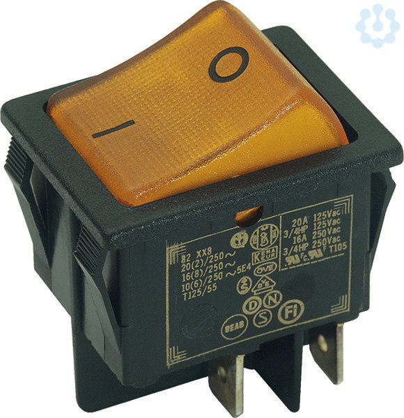 Wippenschalter Serie 3652 16(6) A 250V Ausschalter, 2polig, beleuchtet Gehäuse: schwarz / Wippe: gelb Flachsteckanschlüsse 6,3 x 0,8 mm, Einrastbefestigung für Ausschnitt 22 x 30 mm