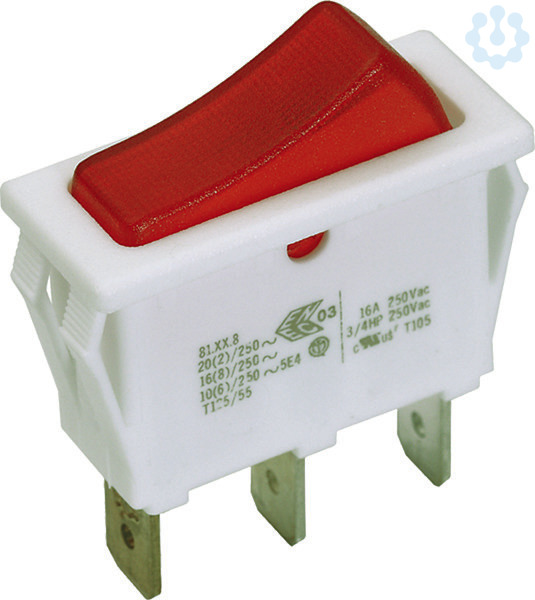 Wippenschalter Serie 3652 16(6) A 250V Ausschalter, 1polig, beleuchtet Gehäuse: weiß / Wippe: rot Flachsteckanschlüsse 6,3 x 0,8 mm, Einrastbefestigung für Ausschnitt 11 x30 mm.