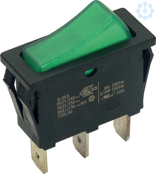 Wippenschalter Serie 3652 16(6) A 250V Ausschalter, 1polig, beleuchtet Gehäuse: schwarz / Wippe: grün Flachsteckanschlüsse 6,3 x 0,8 mm, Einrastbefestigung für Ausschnitt 11 x30 mm.