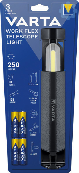 Ausziehbare Arbeitsleuchte mit 2 Leuchtmodi (Spotlicht und Flächenlicht) und einem gummierten Anti-Rutsch-Griff. Das Flächenlicht erscheint wenn die Taschenlampe ausgezogen ist. Verschiedene Befestigungsmöglichkeiten durch einen integrierten Haken und Magnet für ein freihändiges Arbeiten. Teleskop-Flächenlicht und COB LED-Technologie beim Flächenlicht. Hochleistungs-LED, ausziehbarer Haken, Magnet, gummierter Anti-Rutsch-Griff, stoßfest 2m, IPX4 spritzwassergeschützt und schmutzresistente Oberfläche.