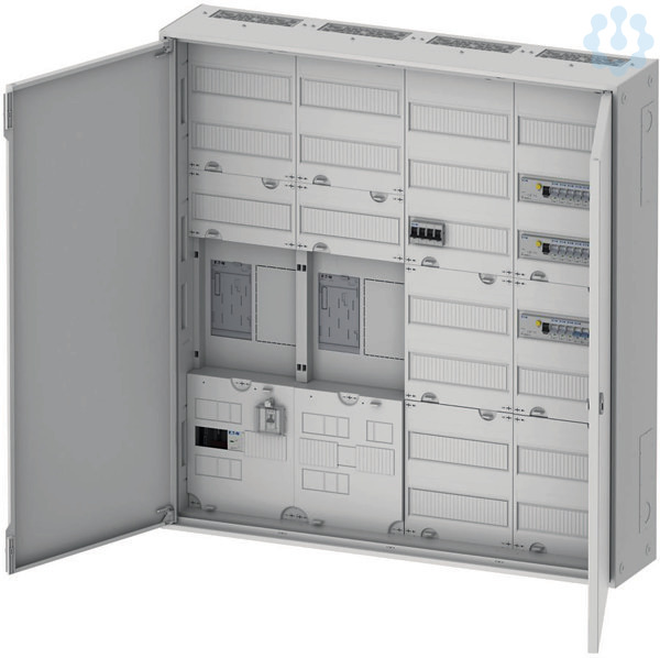 Zählerschrank eHZ 1.100 mm PV-Ready, Messkonzept in Kaskadenschaltung und mit Überschusseinspeisung, Bestückt + vorverdrahtet durch Eaton, Feldanzahl = 4, Zählerplätze vorverdrahtet = 2, Zählerplätze Reserve = 2, Zählerplätze Verdrahtung = 16mm², Verteilerreihen = 5+7, Sammelschienen 5-polig, HLAK 5-polig, Anschlussklemmen. Zählerbrett 1 (ZP1) für Zweirichtungszähler zur Überschusseinspeisung einer Erzeugungsanlage, Zählerbrett 2 (ZP2) für Haushaltszähler, Hauptschalter für Wärmepumpe, Ausreichend Platzreserve für Heimautomatisierung, Mit vorverdrahteten Schalt- und Schutzgeräten, Individuell erweiterbar