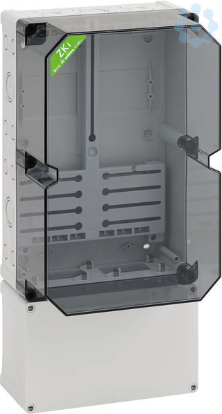 Zählergehäuse, Industrie Qualität, mit transparentem Deckel, serienmäßig plombierbar, mit montiertem Zählerkreuz und Zählerbefestigungsschrauben, zusätzlicher Anschlussraum unten 150mm mit 35mm Normschiene, mit Doppelmembranstutzen, Verschluss- und Isolierstopfen, für Drehstromzähler