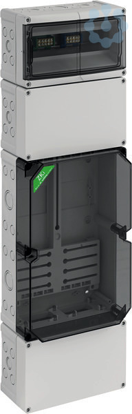 Zählergehäuse, Industrie Qualität, mit transparentem Deckel, serienmäßig plombierbar, mit montiertem Zählerkreuz und Zählerbefestigungsschrauben, zusätzlicher Anschlussraum unten 150mm mit 35mm Normschiene, serienmäßig plombierbarer Konsumentenraum oben, mit 35mm Normschiene und PE/N-Doppelklemmen, Zusatzraum mit 35mm Normschiene, mit Doppelmembranstutzen, Verschluss- und Isolierstopfen, geeignet für Rundsteuerempfänger nach DIN 43861-2, für Zähler mit Drei-Punkt-Befestigung und einer Tiefe von max. 80mm