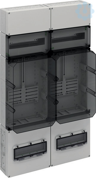 Zählerverteilung in Mehrfach-Kastenbauform nach DIN EN 61439-2/-3, serienmäßig plombierbar, zur Aufputz-Montage im ungemessenen Bereich, Geräte-Einbauflächen nach DIN 43870-1, Zähleranschlussleitungen 5-polig. Einsatz nach individueller Freigabe durch den zuständigen Netzbetreiber, mit Verschlussstopfen, mit Isolierstopfen, mit beiliegenden Belüftungsstopfen IP44 zur Verminderung von Kondenswasser, 2 Zählerfelder, je bestehend aus:, Oberer Anschlussraum, 150mm, ausgerüstet mit 35mm Normschiene zur Aufnahme der Hauptleitungsabzweigklemme HA 25-53 (Zubehör), Raum für Zusatzanwendungen, 150mm, 12TE, ausgerüstet mit 35mm Normschiene zur Aufnahme von zusätzlichen Betriebsmitteln des Netzbetreibers, Messstellenbetreibers oder Messdienstleisters, mit plombierbarer Berührungsschutzabdeckung und transparentem Deckel, Zählerfeld, 450mm, mit transparentem Deckel, für 1 Zähler mit Drei-Punkt-Befestigung, mit montiertem Zählerkreuz für Drehstromzähler und Zählerbefestigungsschrauben, Befestigungsmaße nach DIN 43870-2, Unt