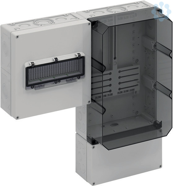 Zählerverteilung in Mehrfach-Kastenbauform nach DIN EN 61439-2/-3, serienmäßig plombierbar, zur Aufputz-Montage im ungemessenen Bereich, Geräte-Einbauflächen nach DIN 43870-1, Zähleranschlussleitungen 5-polig. Einsatz nach individueller Freigabe durch den zuständigen Netzbetreiber, mit Verschlussstopfen, mit Isolierstopfen, mit beiliegenden Belüftungsstopfen IP44 zur Verminderung von Kondenswasser, Oberer Anschlussraum, 150mm, ausgerüstet mit 35mm Normschiene zur Aufnahme der Hauptleitungsabzweigklemme HA 25-53 (Zubehör), Zählerfeld, 450mm, mit transparentem Deckel, für 1 Zähler mit Drei-Punkt-Befestigung, mit montiertem Zählerkreuz für Drehstromzähler und Zählerbefestigungsschrauben, Befestigungsmaße nach DIN 43870-2, Unterer Anschlussraum, 300mm, serienmäßig plombierbar, mit 35mm Normschiene für Hauptsicherungsautomat, mit PE/N-Doppelklemmen, mit Klappfenster 12TE für Laienbedienung der Hauptsicherungsautomaten und zusätzlichem Raum für Überspannungsschutzgeräte, Leitungseinführung durch Kabelverschraubung