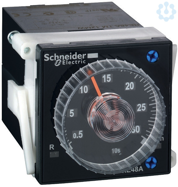 Zelio Time. Dieses Zeitrelais ist für den Fronteinbau in Gehäusen oder Schaltschränken vorgesehen, bei denen Anwender über einen großen Regler die Zeit jederzeit und einfach einstellen können. Dazu ist ein quadratischer Ausschnitt von 48x48 mm notwendig. Nach dem Einbau wird auf der Rückseite die Verdrahtung an Relaissockel vorgenommen und dieser einfach angesteckt. Somit ist eine einfache Installation und schneller Wechsel ohne Lösen der Verdrahtung möglich. Über 2 LEDs wird der Status angezeigt. Anzahl Zeitfunktionen 1 - Zeitfunktion ansprechverzögert - Zeitbereich 0,02 s-300 h - Ausgänge 2 Relaiswechsler, belastbar jeweils bis 5 A - Betriebsspannung 24-240 VAC/DC - Anschluss 8polige Rundsteckverbinder.