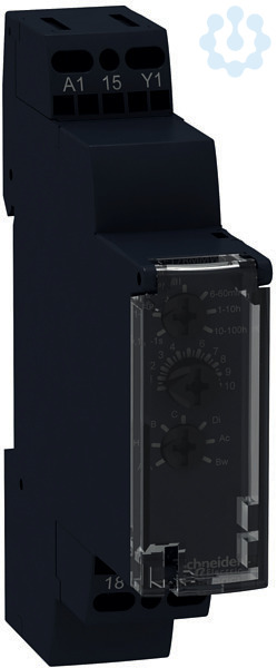 Zelio Time. Elektronisches Multifunktions-Zeitrelais zur Steuerung von Automatisierungsanwendungen. Es verfügt über 10 Zeitfunktionen. Der Zeitbereich beträgt 0,1 s - 100 h. Am Ausgang schaltet ein Relaiswechsler, der bis 8 A belastbar ist. Die Einstellungen erfolgen über Bedienelement in der Front, die unter einer Klarsichtabdeckung gegen Veränderungen geschützt werden können. Eine LED zeigt den Status an. Die Baubreite beträgt 17,5 mm, die Montage erfolgt auf der Hutschiene und der Leitungsanschluss über Schraubklemmen. Die Versorgungsspannung beträgt 12 VAC/DC.
