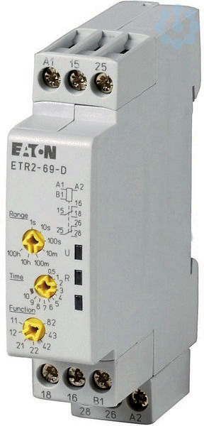 Elektronisches Multifunktionszeitrelais ETR2 gemäß IEC/EN 61812-1, 17.5 mm breit, Zeitbereich 0,05s-100h, 2 Wechsler einstellbar, 11 ansprechverzögert, 21 einschaltwischend, 42 blinkend, impulsbeginnend, 43 blinkend, pausenbeginnend, 12 rückfallverzögert, 22 ausschaltwischend, 82 impulsformend