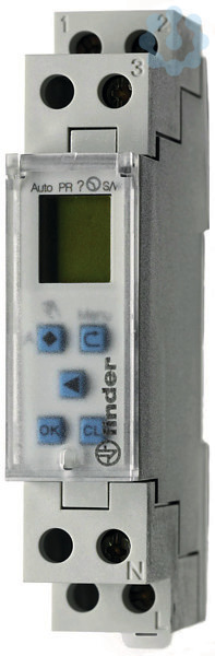 Elektronische Schaltuhr für DIN-Schiene, 1 Wechsler für 16 A, Kontaktmaterial AgNi, max. Schaltleistungen bei 230 V AC: AC1 4000 VA, AC15 420 VA, Lampenlasten: Glüh- und Halogenlampen 400 W, Energiesparlampen 50 W, LED (230 V AC) 50 W, NV-Halogenlampen oder LED mit EVG 50 W, NV-Halogenlampen oder LED mit KVG 100 W, Leuchtstofflampen mit EVG 100 W, Leuchtstofflampen mit KVG 100 W, Tages- und Wochenprogramm mit 6 Jahren Gangreserve, automatische Sommer-/Winterzeitumstellung, 30 Speicherplätze, Impulsprogramm. Anschlussspannung: 230 V AC, 17,5 mm breit