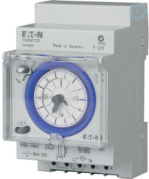 Reiheneinbau-Schaltuhr ca. 200 Stunden Gangreserve, Breite 52,5 mm, 7-Tage-Programm., kürzeste Schaltzeit 2 Std., Uhrzeiger für Zeitanzeige und 12h/24h Erkennung, Uhrzeitkorrektur im und gegen den Uhrzeigersinn möglich, Schaltungsvorwahl, Handschalter mit 3 Stellungen: Dauer-EIN/AUTO/Dauer-AUS, Schaltzustandsanzeige, DuoFix Federsteckklemmen für jeweils 2 Leiter, 1 Wechsler, 16 A/250 V~, 230V /45-50 Hz, Klarsichtabdeckung plombierbar.