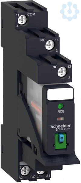 Zelio Relay. Vormontiertes und direkt einsetzbares Interface-Relais RXG bestehend aus Relais, Sockel, Schutzmodul, Haltebügel und Beschriftungsschild. Anzahl Kontakte- 1, Ausführung- Relaiswechsler, Kontaktbelastbarkeit- 10 A. Spulen-Steuerspannung- 24 VDC. Mechanische Stellungsanzeige- ja, LED-Anzeige- ja. Prüftaste zum Testen der Kontakte- ja, Prüfhebel zur dauerhaften Umschaltung für Testzwecke- ja, Bedienung- werkzeuglos. Stecksockel mit Schraubklemmen in getrennter Anordnung zur Montage auf Hutschiene oder aufschraubbar auf Montageplatte. Schutzmodul- Diode. Kunststoffhaltebügel zur Fixierung und einfachen Entnahme des Relais. Beschriftungsschild zur Kennzeichnung. Alle Komponenten sind einsatzfertig montiert und das vormontierte Relais kann sofort eingesetzt werden.