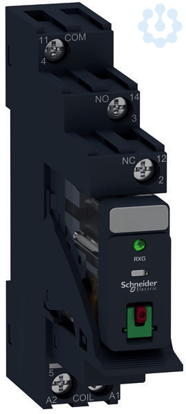 Zelio Relay. Vormontiertes und direkt einsetzbares Interface-Relais RXG bestehend aus Relais, Sockel, Schutzmodul, Haltebügel und Beschriftungsschild. Anzahl Kontakte- 1, Ausführung- Relaiswechsler, Kontaktbelastbarkeit- 10 A. Spulen-Steuerspannung- 24 VAC. Mechanische Stellungsanzeige- ja, LED-Anzeige- ja. Prüftaste zum Testen der Kontakte- ja, Prüfhebel zur dauerhaften Umschaltung für Testzwecke- ja, Bedienung- werkzeuglos. Stecksockel mit Schraubklemmen in getrennter Anordnung zur Montage auf Hutschiene oder aufschraubbar auf Montageplatte. Schutzmodul- Varistor. Kunststoffhaltebügel zur Fixierung und einfachen Entnahme des Relais. Beschriftungsschild zur Kennzeichnung. Alle Komponenten sind einsatzfertig montiert und das vormontierte Relais kann sofort eingesetzt werden.