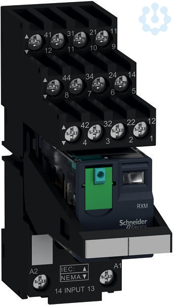 Zelio Relay. Vormontiertes und direkt einsetzbares Miniaturrelais RXM bestehend aus Relais, Sockel, Haltebügel und Beschriftungsschild. Anzahl Kontakte- 4, Ausführung- Relaiswechsler, Kontaktbelastbarkeit- je 6 A. Spulen-Steuerspannung- 24 VDC. Mechanische Stellungsanzeige- ja, LED-Anzeige- ja. Prüftaste zum Testen der Kontakte- ja, Prüfhebel zur dauerhaften Umschaltung für Testzwecke- ja, Bedienung- werkzeuglos. Stecksockel mit Schraubklemmen in kombinierter Anordnung zur Montage auf Hutschiene oder aufschraubbar auf Montageplatte. Kunststoffhaltebügel zur Fixierung und einfachen Entnahme des Relais. Beschriftungsschild zur Kennzeichnung. Alle Komponenten sind einsatzfertig montiert und das vormontierte Relais kann sofort eingesetzt werden.