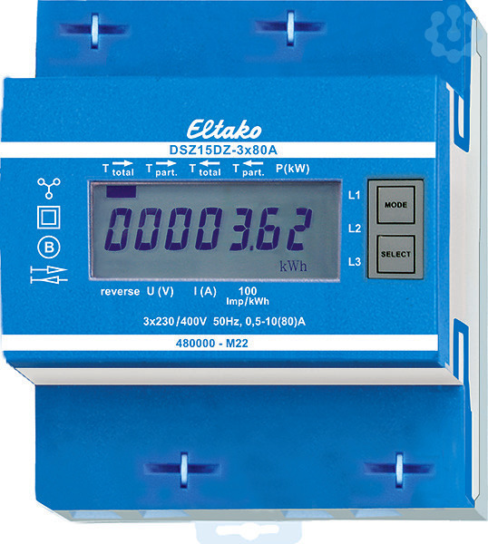 Maximalstrom 3x80A, Stand-by-Verlust nur 0,5 Watt je Pfad. Reiheneinbaugerät für Montage auf Tragschiene DIN-EN 60715 TH35. 4 Teilungseinheiten = 70mm breit, 58mm tief. Genauigkeitsklasse B (1%). Mit S0-Schnittstelle. Der direkt messende Drehstromzähler misst die Wirkenergie anhand der zwischen den Eingängen und Ausgängen fließenden Ströme. Der Eigenverbrauch von nur maximal 0,5 Watt Wirkleistung je Pfad wird nicht gemessen und nicht angezeigt. Die Wirkenergie wird abhängig vom Vorzeichen addiert. Positive Leistung im Zähler bedeutet Energiebezug, eine negative Leistung bedeutet Energielieferung. Die Energiemessung erfolgt saldierend. Wenn der Energiebezug (P positiv) größer ist als die Energielieferung (P negativ) wird der Zählerstand T Preil rechts erhöht. Falls die Energielieferung größer ist als der Energiebezug, wird der Zählerstand T Pfeil links erhöht. Energiebezug wird mit einem Rechtspfeil und Energielieferung wird mit einem Linkspfeil jeweils über dem aktiven Balken im Display angezeigt. Es können 1