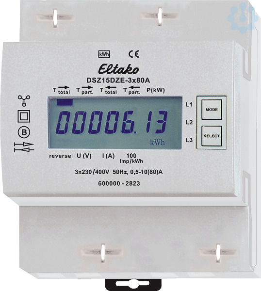 Zweiweg-Drehstromzähler. Maximalstrom 3x80A, Stand-by-Verlust nur 0,5 Watt je Pfad. Reiheneinbaugerät für Montage auf Tragschiene DIN-EN 60715 TH35. 4 Teilungseinheiten = 70mm breit, 58mm tief. Genauigkeitsklasse B (1%). Mit S0-Schnittstelle. Der direkt messende Drehstromzähler misst die Wirkenergie anhand der zwischen den Eingängen und Ausgängen fließenden Ströme. Der Eigenverbrauch von nur maximal 0,5 Watt Wirkleistung je Pfad wird nicht gemessen und nicht angezeigt. Die Wirkenergie wird abhängig vom Vorzeichen addiert. Positive Leistung im Zähler bedeutet Energiebezug, eine negative Leistung bedeutet Energielieferung. Die Energiemessung erfolgt saldierend. Wenn der Energiebezug (P positiv) größer ist als die Energielieferung (P negativ) wird der Zählerstand T Pfeil nach rechts erhöht. Falls die Energielieferung größer ist als der Energiebezug, wird der Zählerstand T Pfeil nach links erhöht. Energiebezug wird mit einem Rechtspfeil und Energielieferung wird mit einem Linkspfeil jeweils über dem aktiven Balk